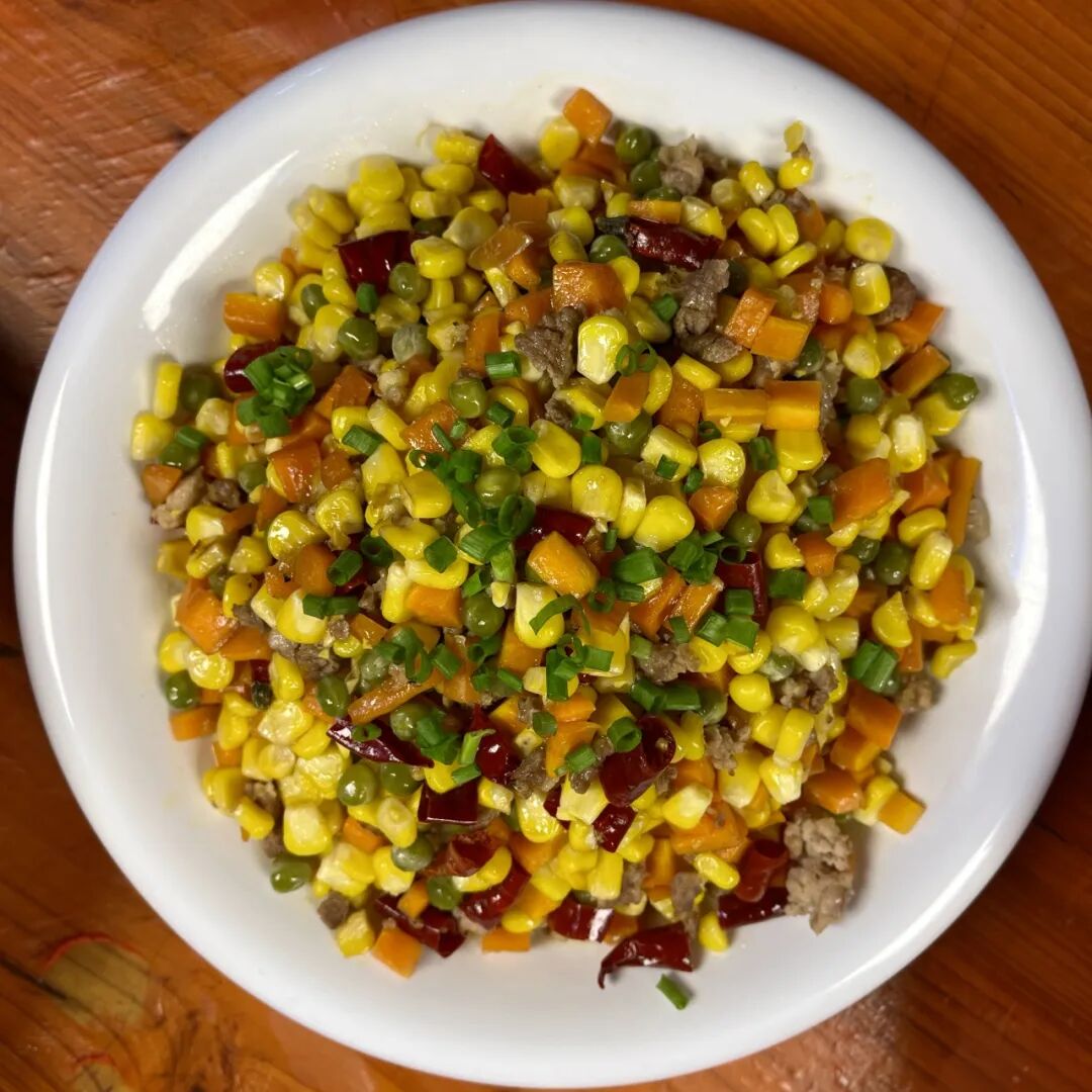 新鲜的玉米、胡萝卜、豌豆粒、肉末加上少量的佐料做翻炒,出锅即可制成色、香、味俱全的舌尖美食。勤劳的雅瑶人民在重要的节庆盛会都会做这道菜,表达他们希望家庭幸福美满、儿孙满堂的美好期盼,也象征着各民族同胞紧紧团结在一起的情谊。