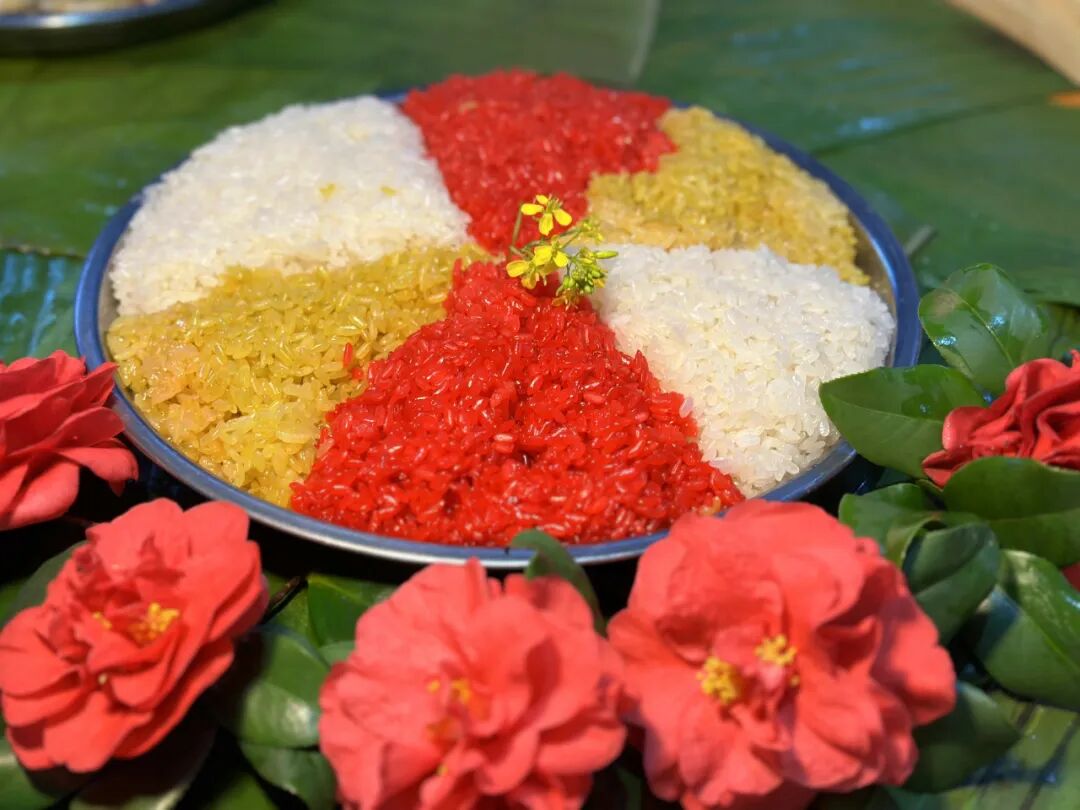 壮族人民于生活中的色彩运用,编织绘就壮乡浪漫的底色。而于食物,壮乡人民同样有着“出彩”的表达,长期生活在大山中的壮乡人民,采撷自然之色,配以本地糯米,制成红、黄、白三色饭,浸染吉祥祝愿。一份色泽艳丽,散发植物芳香的五色糯米饭,是田间与山林的跨界合鸣,是稻作文明与原生自然的精彩碰撞,反映出壮族人民与山川共生的饮食智慧,亦表达了壮族人民对自然的赞美和感恩。