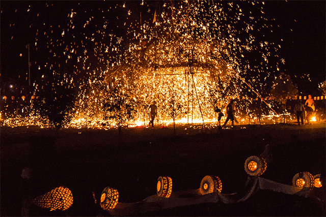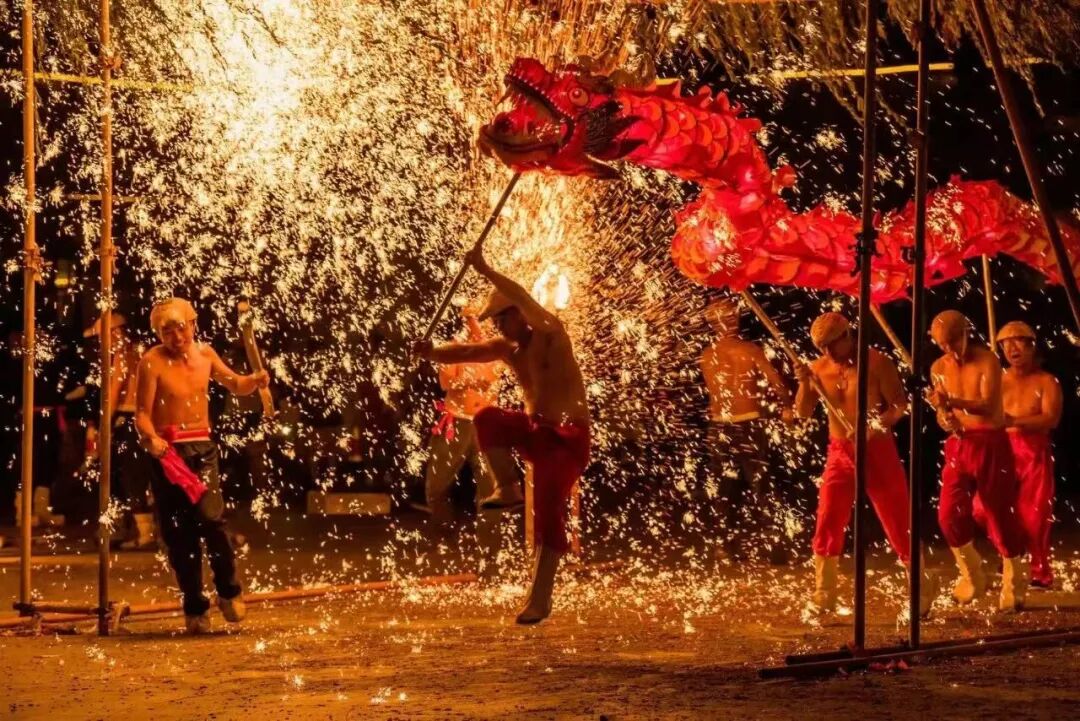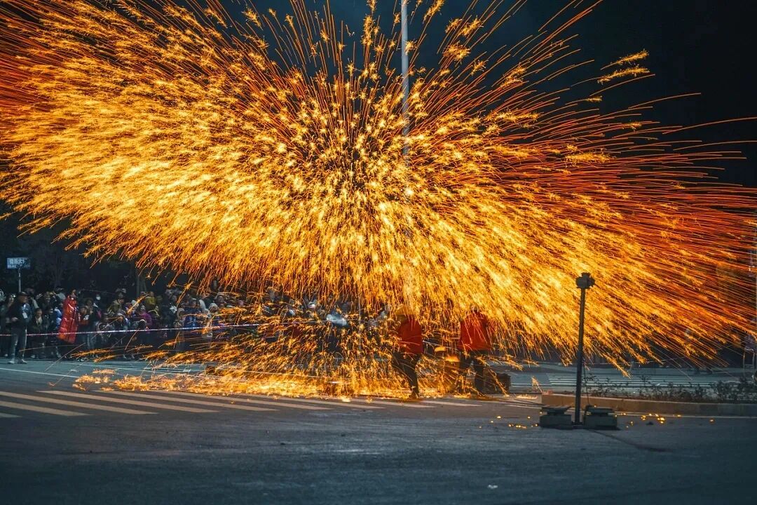 灿烂如花绽夜空,流星似雨洒峦崇。有一种景观,它灿若烟花,美丽却让人望而却步——因为要将1600多摄氏度的铁水打向高空,才能产生这样的美,铁花在空中迸散开来,犹如满树盛开的梨花。整个打铁花进程是由四五个人协作,一人用勺舀起铁水,甩到空中,另一人头戴草帽,用特制的木板将铁水敲打开来,铁水在夜空中散落,一片灿烂的星花在夜色中绽放开来,表演者冒着被烫伤的风险,只为夜间那漫天华彩、遍地生金的景象。