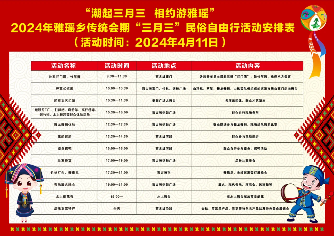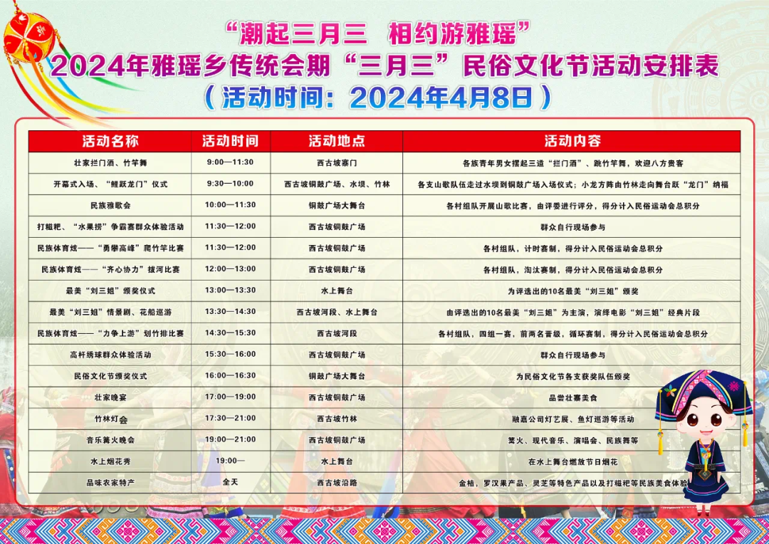 2024年雅瑶乡传统会期“三月三”民俗文化节活动安排表。