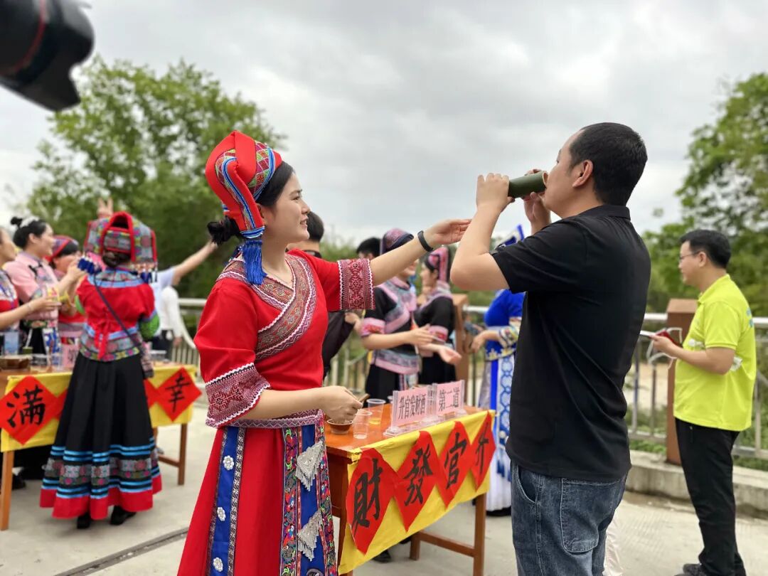 “贝呀侬哎,客人来到家门口咧,敬上三杯迎客酒,米酒香醇山歌唱,壮家情意捧呀捧在手......”活动将从寓意“健康长寿、升官发财、幸福美满”的三道拦门酒开始,拦门酒是最高的迎宾礼仪,美丽的各族姑娘们身穿节日服装,载歌载舞在寨门两侧相迎,加上竹竿舞清脆的敲打声,热情欢迎宾客进寨纳福。